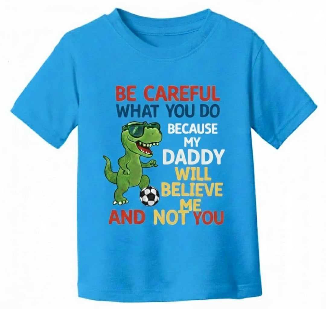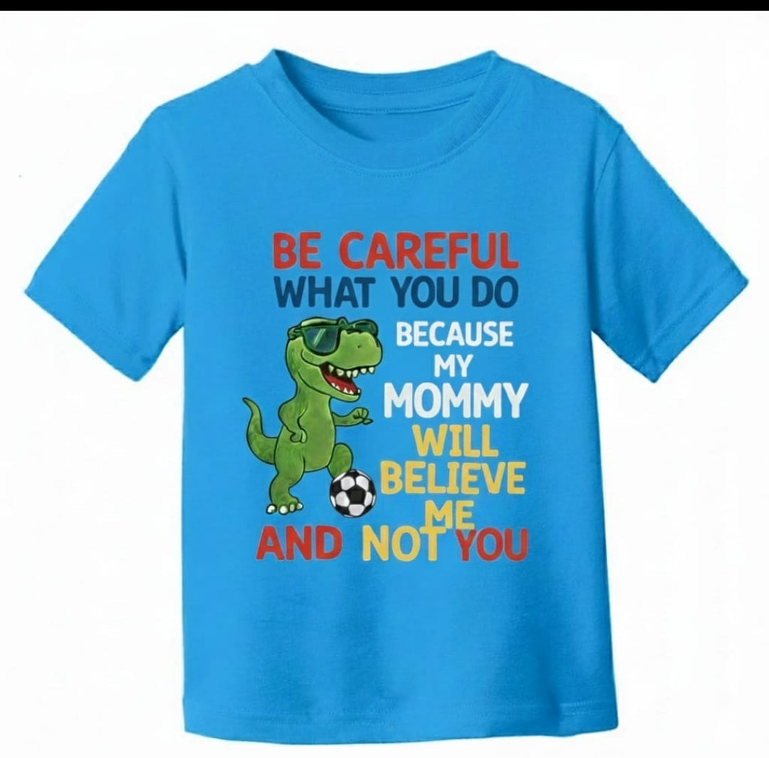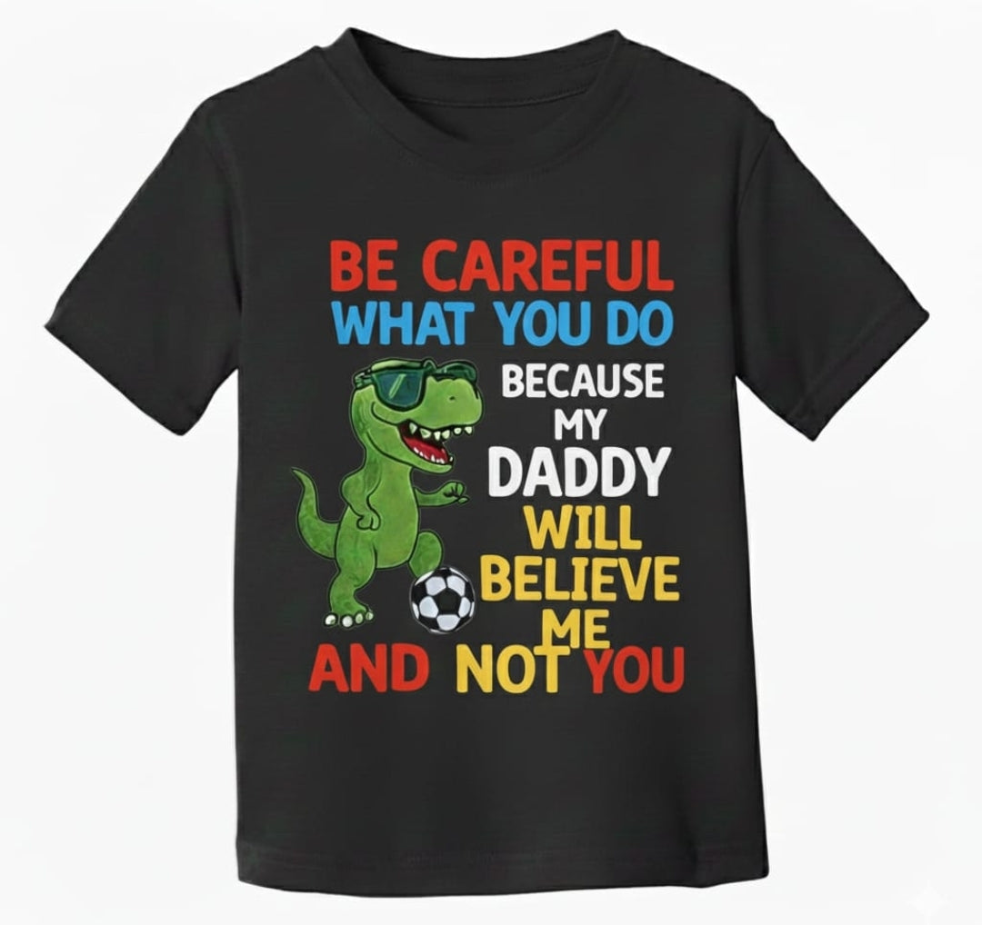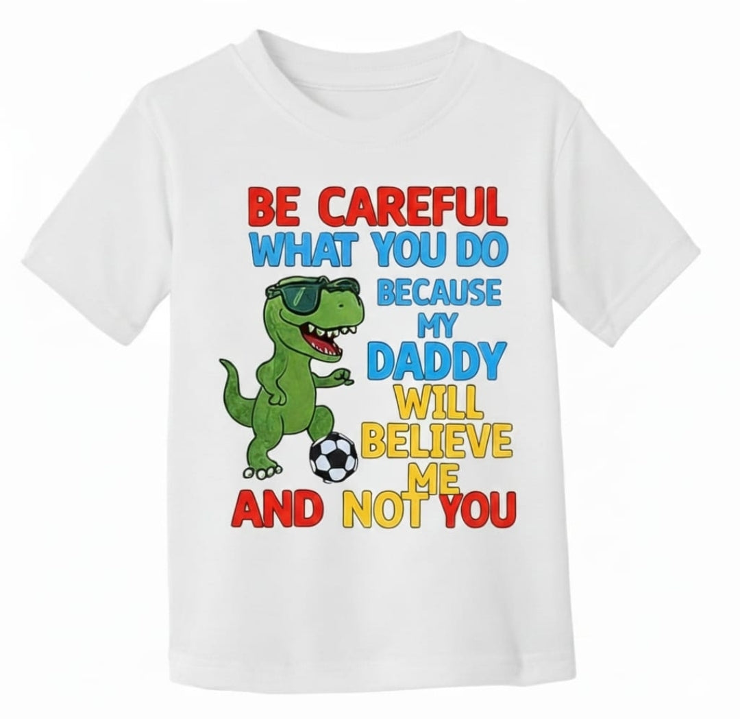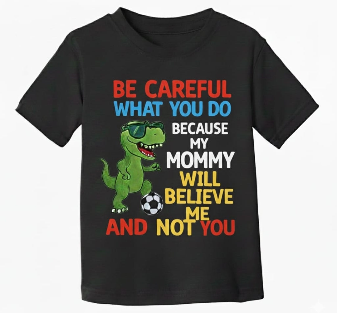 Featuring a bold, athletic-style dinosaur and the empowering message: “Be careful what you do because my mommy/daddy will believe me and not you". A confident signal that this child is protected.
