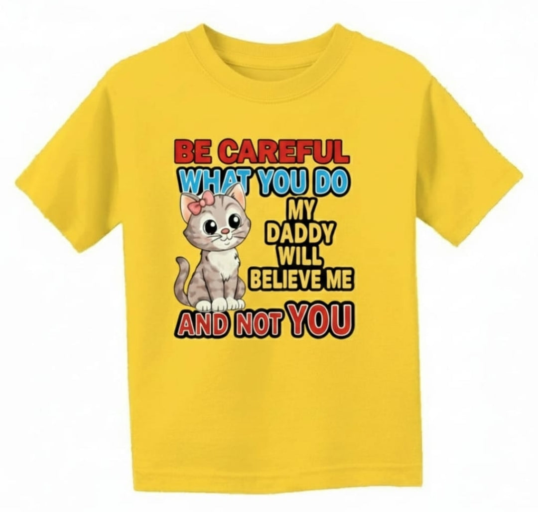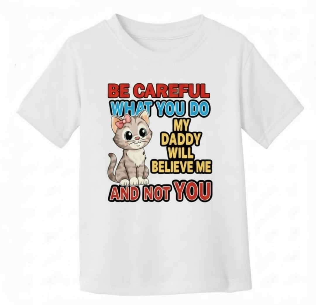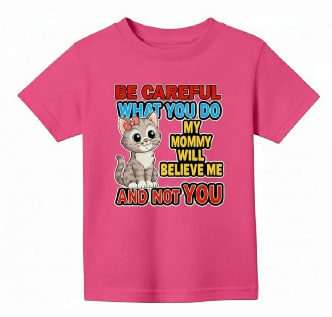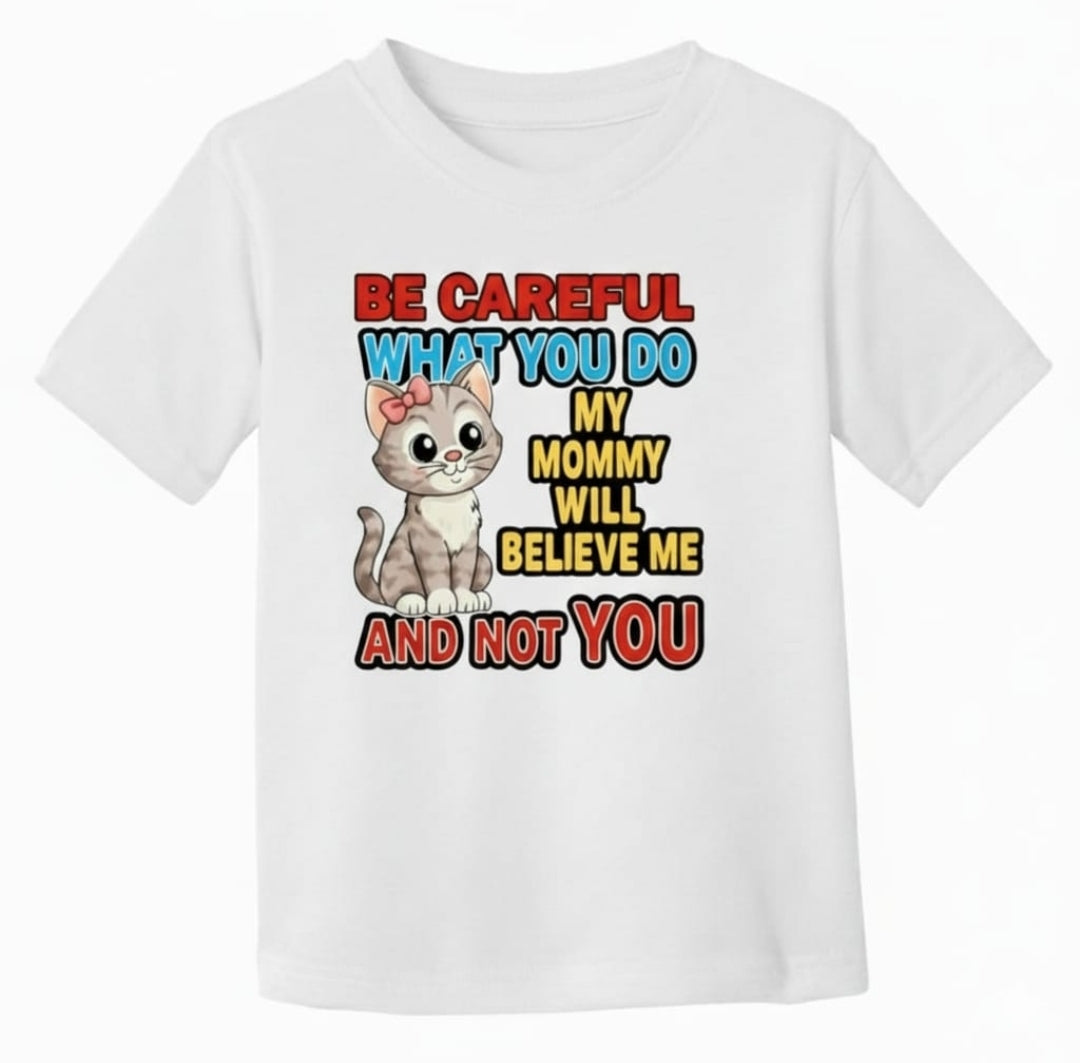Cute with a strong message ("Be careful what you do my mommy/daddy will believe me and not you") that empowers children wherever they go. 100% pre-shrunk, ring-spun cotton.